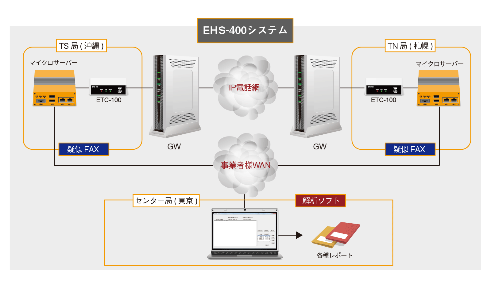 FAX疎通確認・測定システム「EHS-400」は、全システムを自動制御するセンター局(Windows PCにEHS-400Aシステム制御ソフトウェアを組込み)とTS局(最南端局)/TN局(最北端局)に配置する疑似FAX部から構成されます。